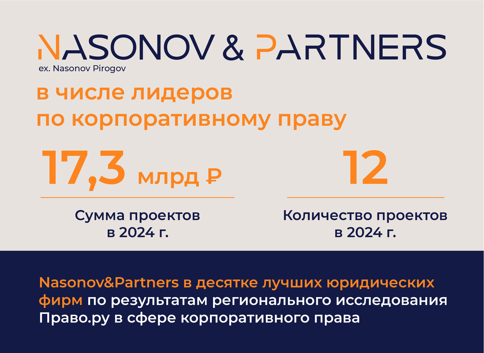 На портале Право.ру появились результаты регионального исследования по корпоративному праву. Nasonov&Partners заняли 8-ую строчку с общей суммой проектов 17,3 млрд рублей среди более двух десятков других юридических фирм.